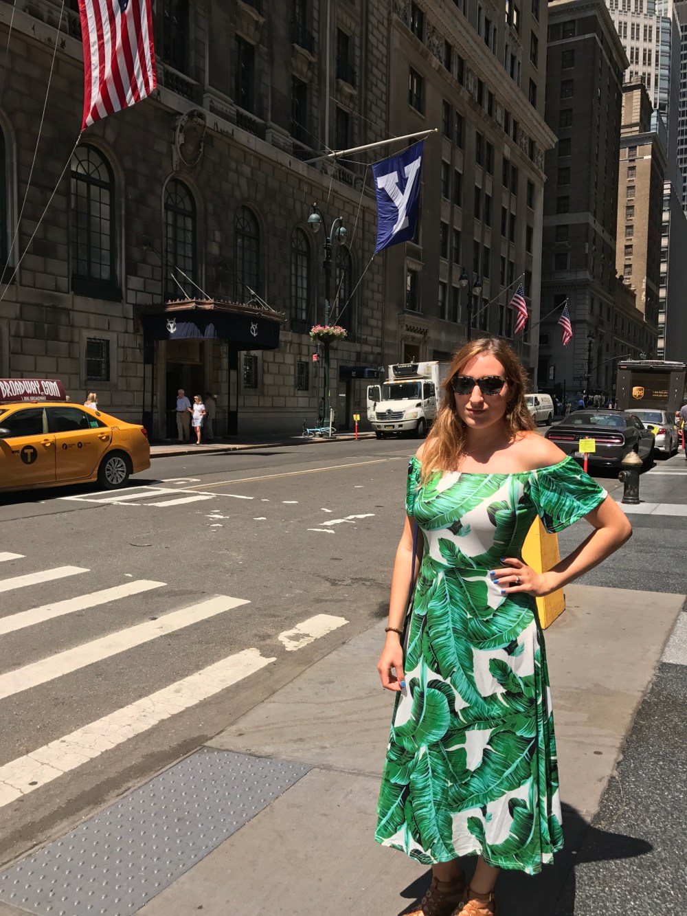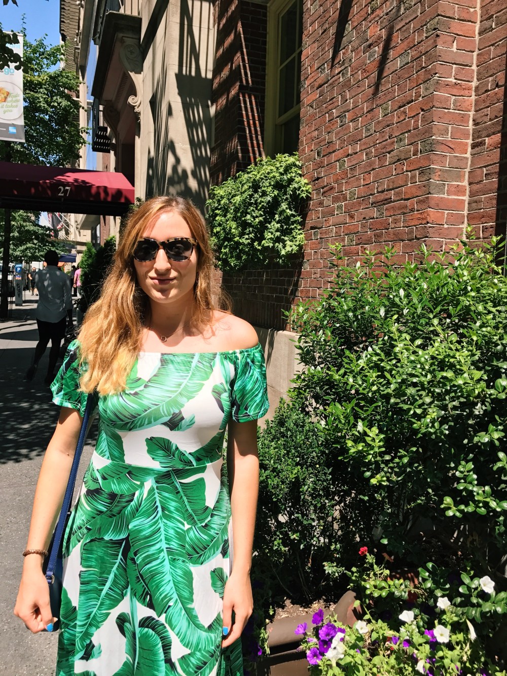Summer days in the city call for light, bright colors and airy dresses. Heading into NYC today for lunch, I chose an incredibly comfortable palm print midi dress with small wedges.