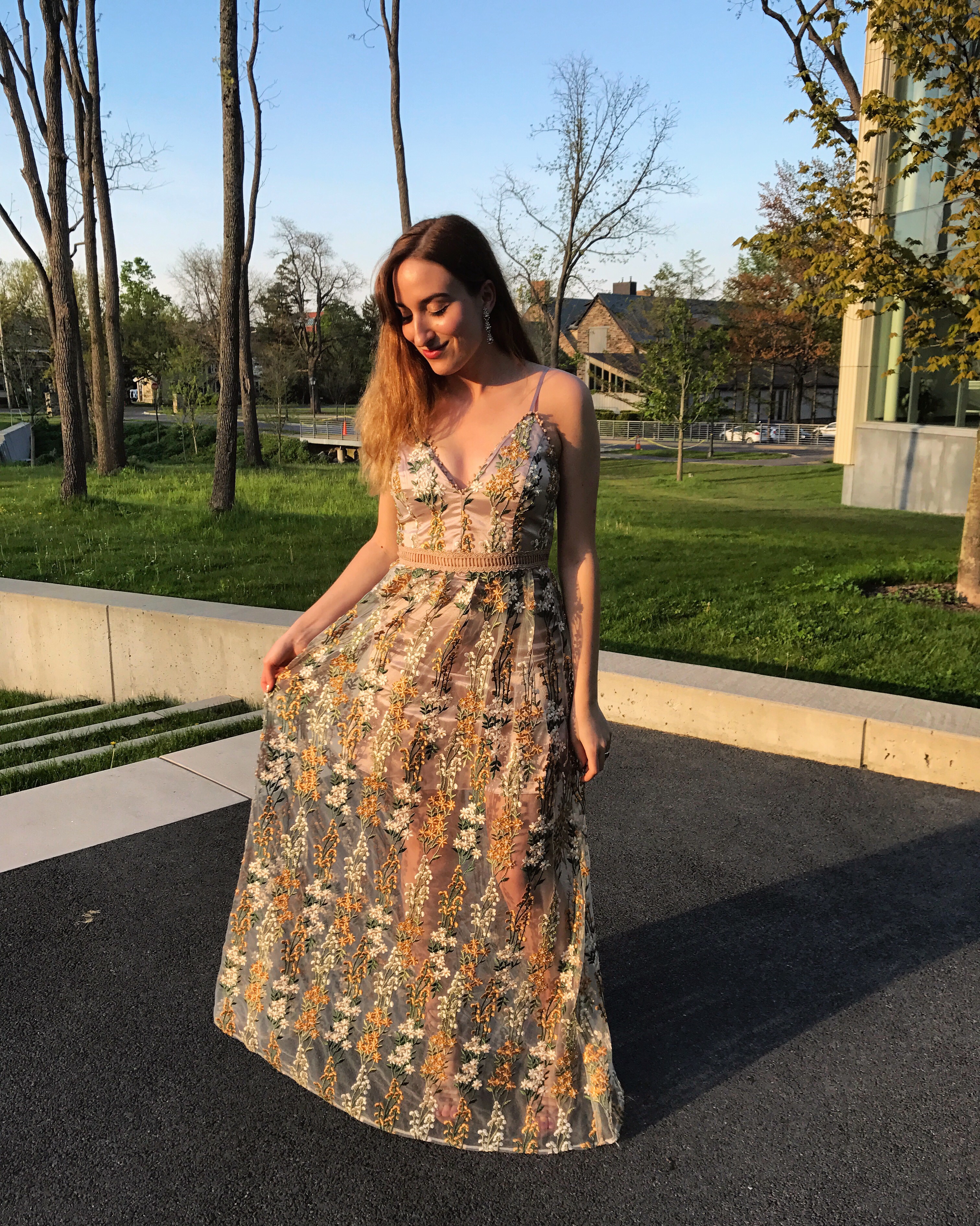 Speaking of graduation events, this dress was for my senior gala during senior week at my school. It was the “last hurrah” to get all dolled up and party the night away with peers and professors before graduating. I chose this golden, sparkly floor length dress to fit the celebratory mood that evening.