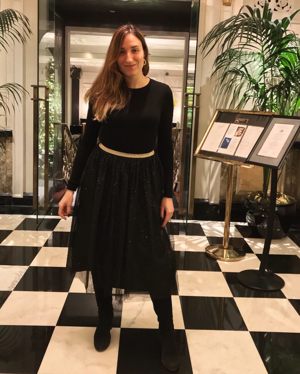 I wore this outfit to tea at The Pierre in NYC. Although this outfit consists of head to toe black, my gold-flecked skirt keeps things interesting. This is a go-to look for when I’m not feeling like getting completely dressed up but still want to look put-together.