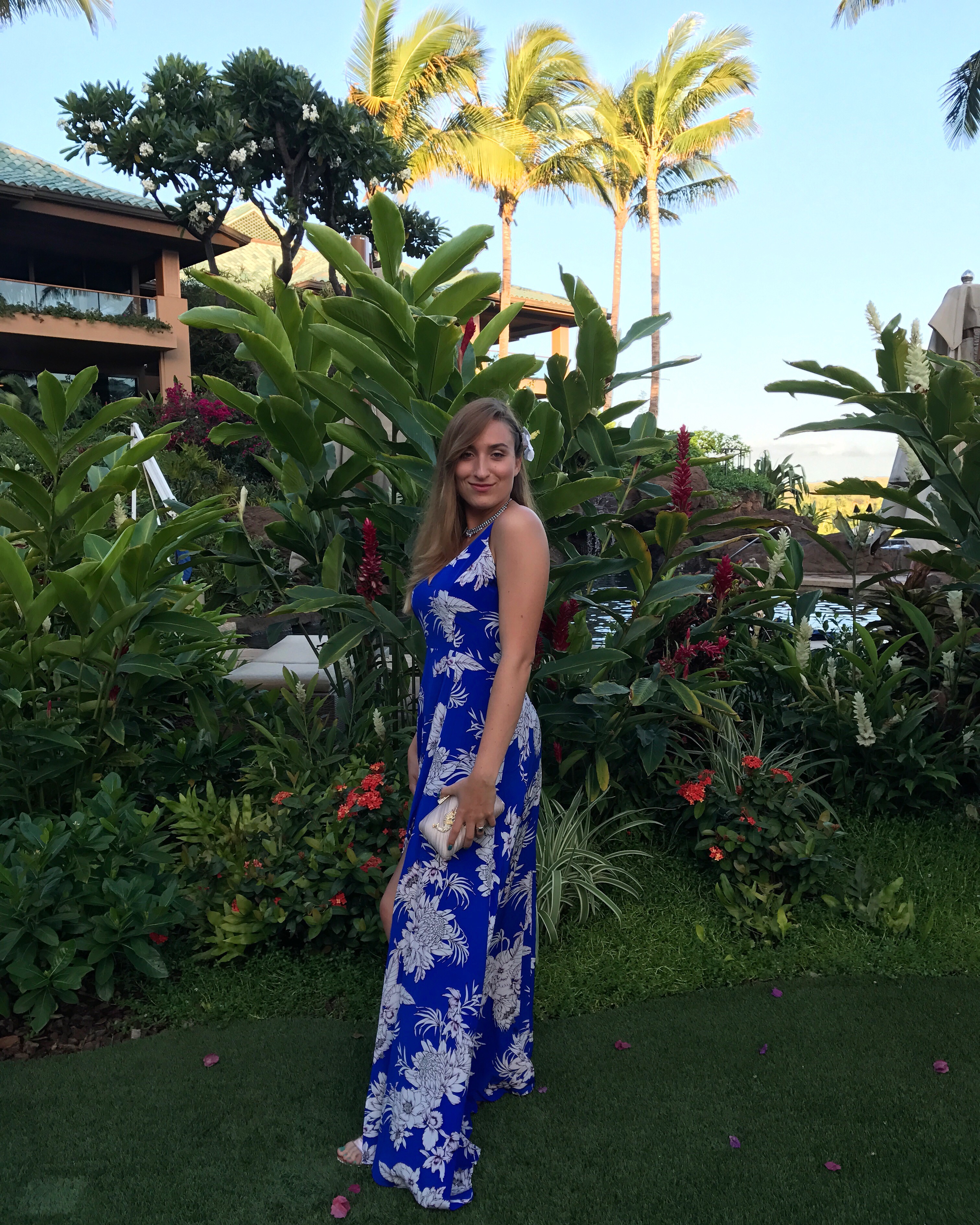This outfit is from my trip to Hawaii. I wore it for my parent’s 25th anniversary dinner on Lana’i. The deep blue floral print and sleek metallic sandals have a fun, tropical vibe. And I had to incorporate an orchid barrette in my hair to continue the floral motif, of course!