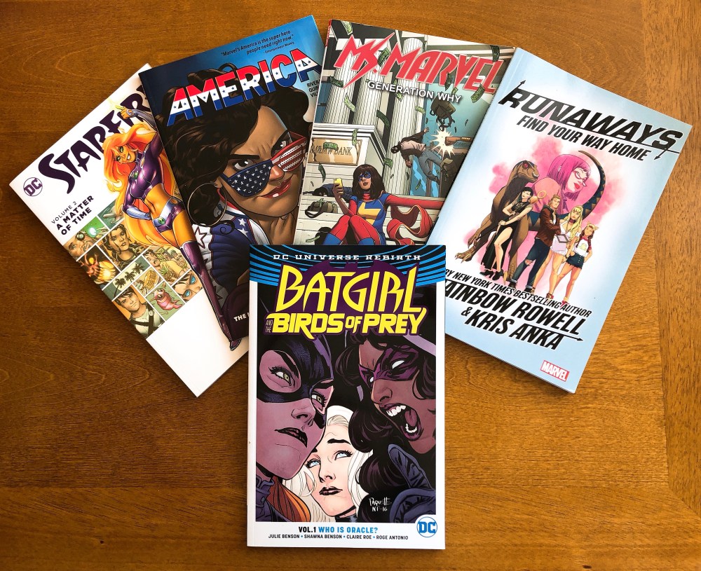 The Runaways – Before it became a successful Hulu show, this series was a hit with young comic book fans for its portrayal of a diverse group of kids trying to fight their evil parents. I will say that the premise isn’t quite that simple (there’s a mole in the team, lots of moral ambiguity, dealing with loss and betrayal, broken families, etc.), and the different personalities and crazy story lines constantly keep readers on their toes. Nico, Gert, Molly, and Carolina are all founding team members and the most powerful individuals of the group. Nico is a sorceress and team leader, Carolina is an alien, Gert has a telepathic link with a centuries old dinosaur, and 12-year-old Molly is a super strong mutant. They all have incredibly different personalities and represent individuals of a variety of ages, races, and sexualities. It’s a refreshing take on youth and how they navigate a world that seems scary and out of control (pretty relatable).