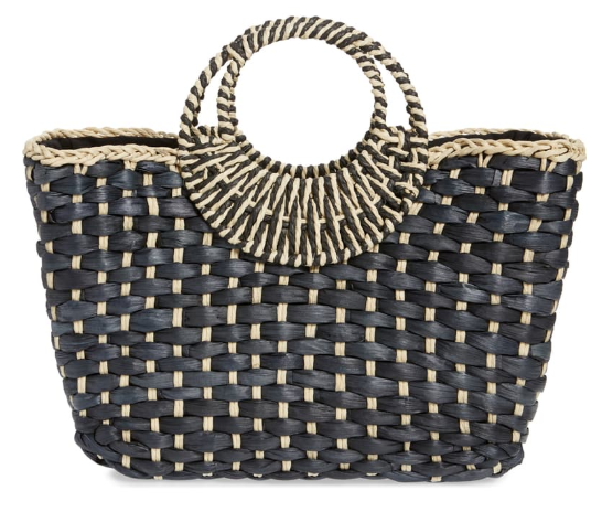 Nordstrom Woven Two-Tone Tote in black ($89) also in pink // Banana Republic Straw Tote ($39) // Malibu Skye Mini Double Zip Backpack ($58) // Malibu Skye Isla Straw Toucan Tote ($59) // Malibu Skye Sand Small Drawstring Bucket ($58)