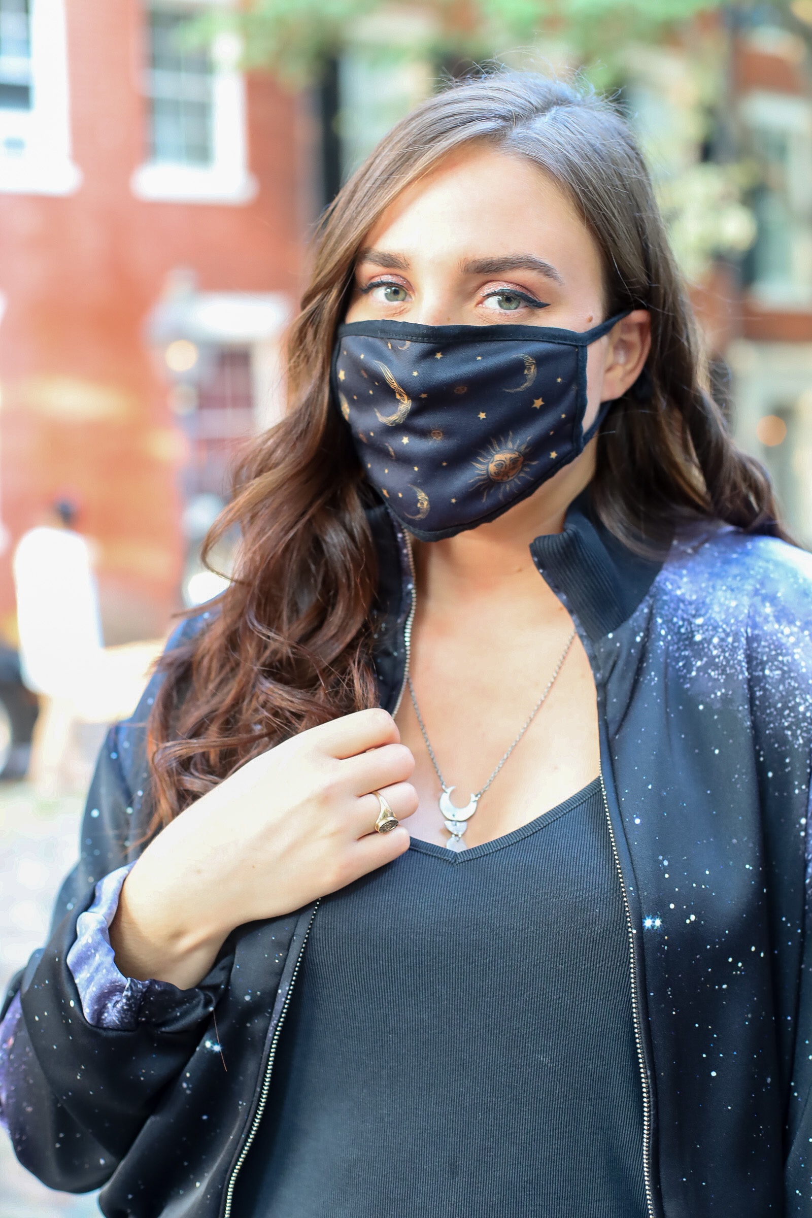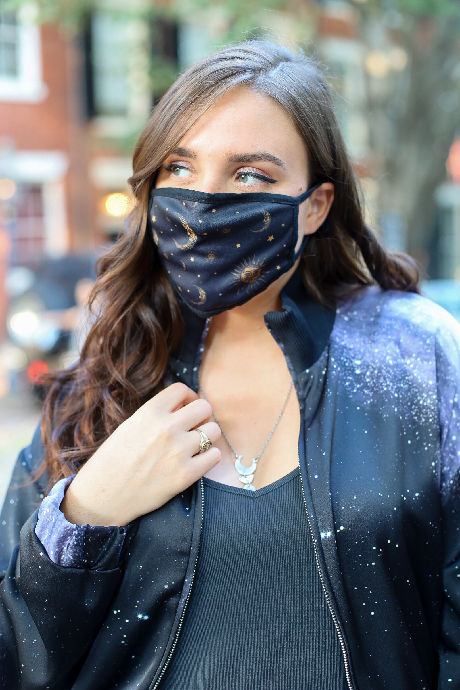 I’m wearing the Brave New Look Celestial Fortunes Mask ($14) but also love my Sydney Summer Black Dot Mask ($14).