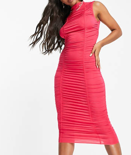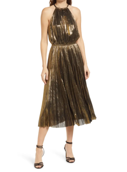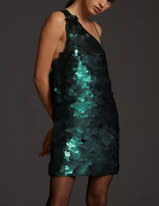 Gold Pleat Lamé Halter Dress ($45 – SALE) // Black sequin high neck mini dress ($56- SALE) // Raspberry high neck double ruched dress ($16 – SALE) // Silver Sequin Shift Dress ($36 – SALE) // Gold Deep V-Neck Long Sleeve Beaded Sheath Gown ($598) // Feather Trim Vegan Leather Slip Dress ($128) // Maeve Turquoise Sequined One-Shoulder Mini Dress ($150 – SALE) // Beaded Illusion Mini Dress ($295)